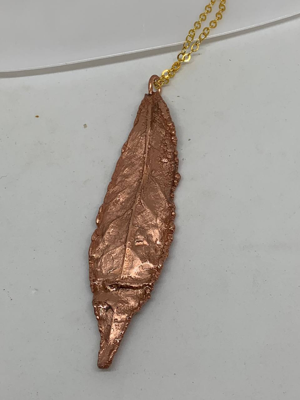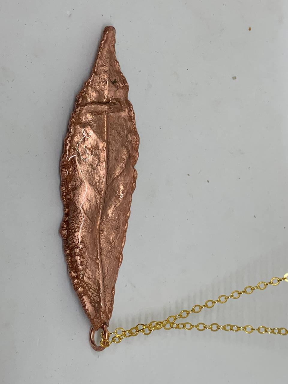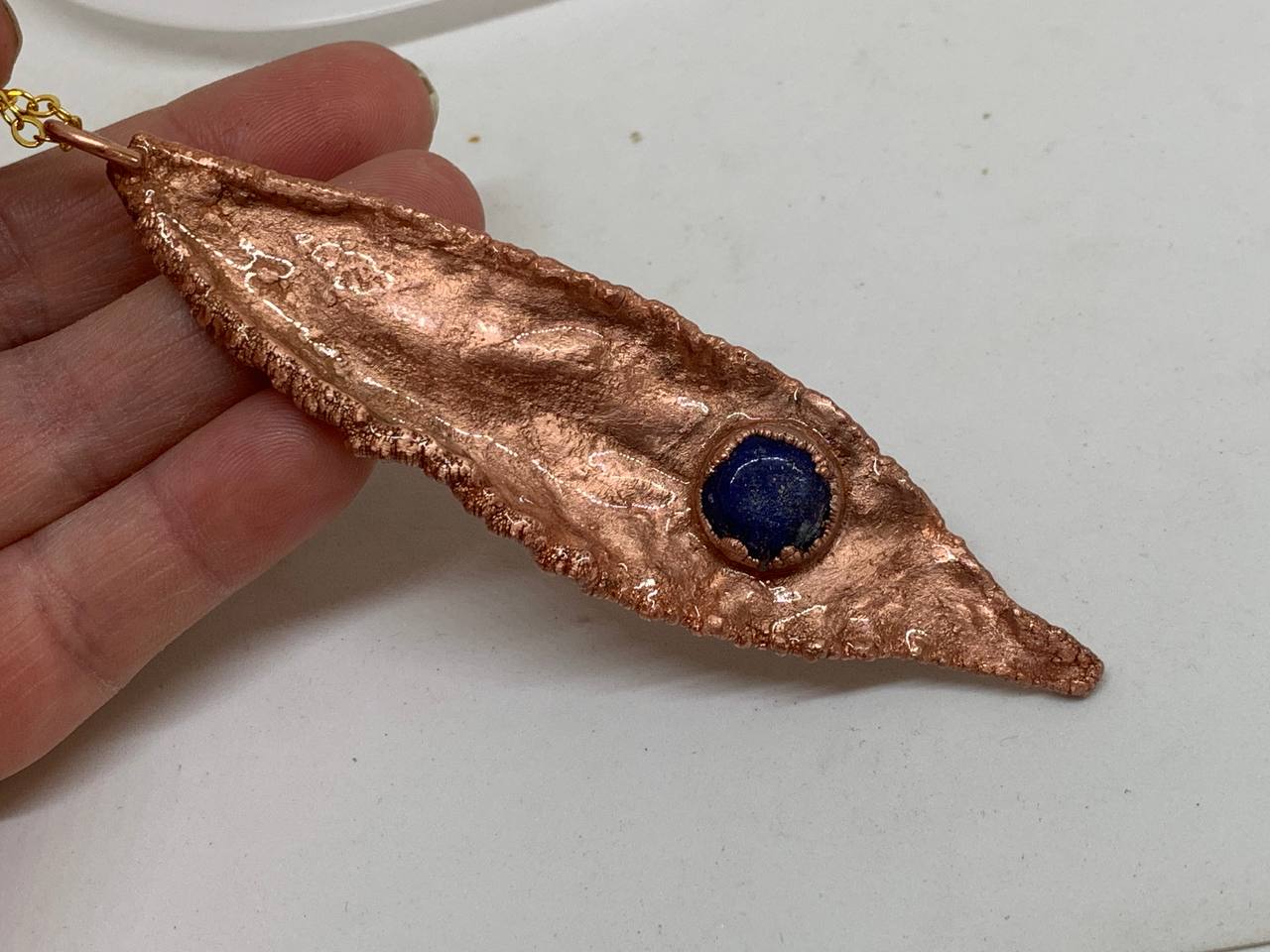 Ho raccolto una foglia di alloro naturale e l'ho immersa in un bagno elettrolitico dove, attraverso un processo chimico controllato, il rame si deposita lentamente sulla foglia, ricoprendola completamente. Questo processo, chiamato elettroformatura, preserva ogni dettaglio della foglia originale. Successivamente ho incastonato a mano la pietra di lapislazzuli, creando un gioiello che unisce natura e artigianalità.