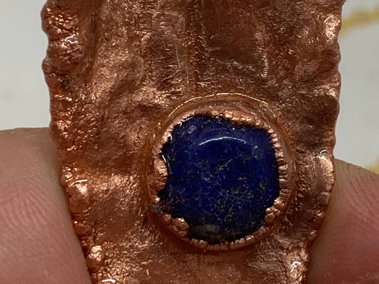 Ciondolo artigianale unico realizzato in rame puro elettroformato con lapislazzuli naturale cabochon da 12mm e una vera foglia di alloro.